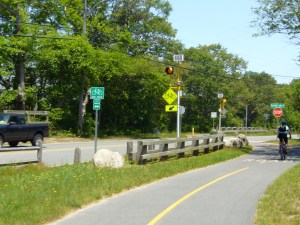 The Cape Cod Rail Trail was very well designed. All of the road crossing points were well constructed, making both the trail and the road crossings easy to traverse for both cycles and motor vehicles. Part of the reason the crossings were so functional was due to the fact that all the at-grade crossings involved only two-lane of one lane roads. All the wider roads had grade separated crossings (usually tunnels, with the occasional overpass). These crossings helped to illustrate a larger point of cycling: people will be far more comfortable cycling if there are grade separated crossings. Yes, this point has been made, and yes they are expensive, but they go a VERY long way towards making life easier for both bike riders/pedestrians and drivers.